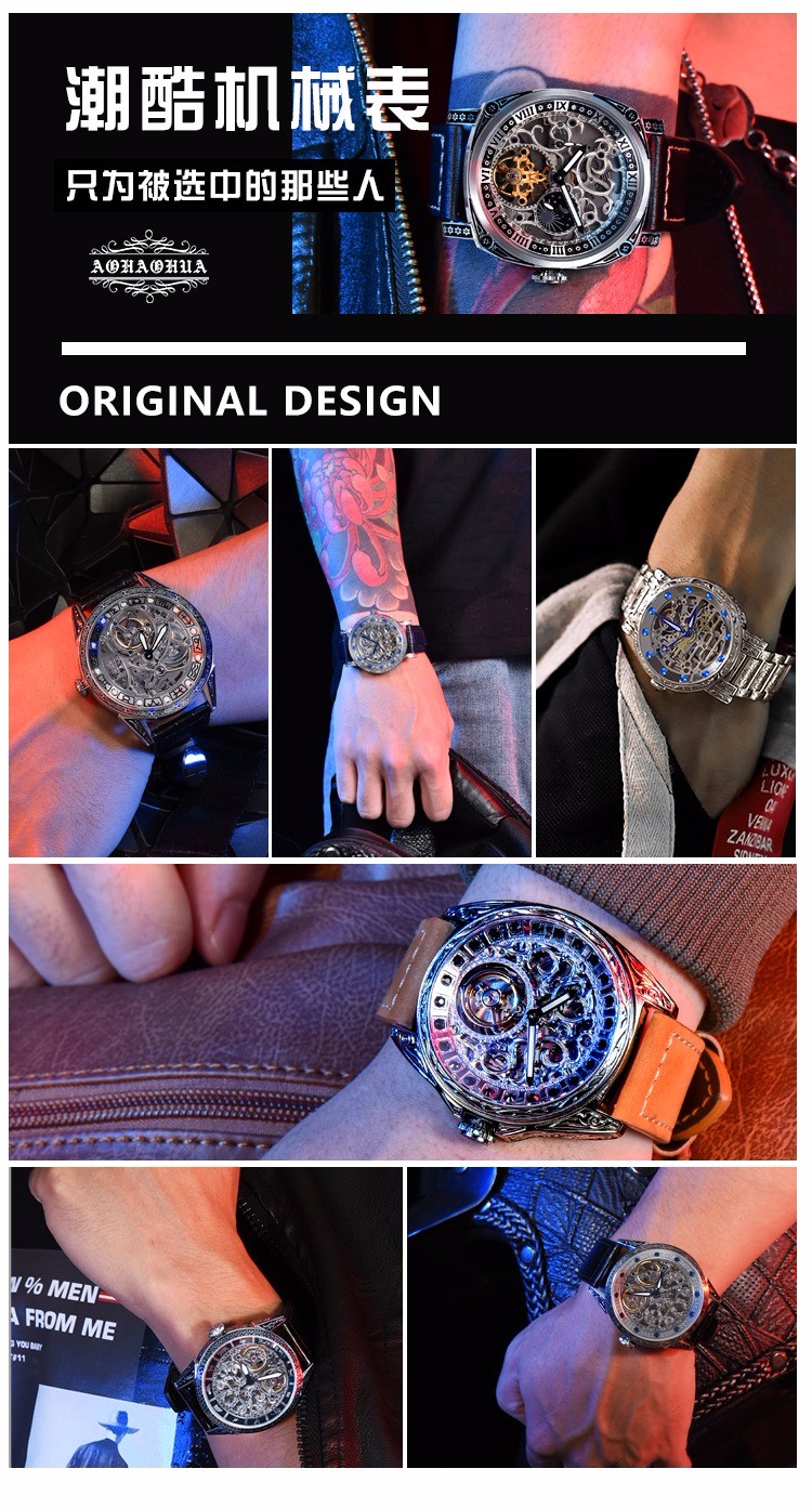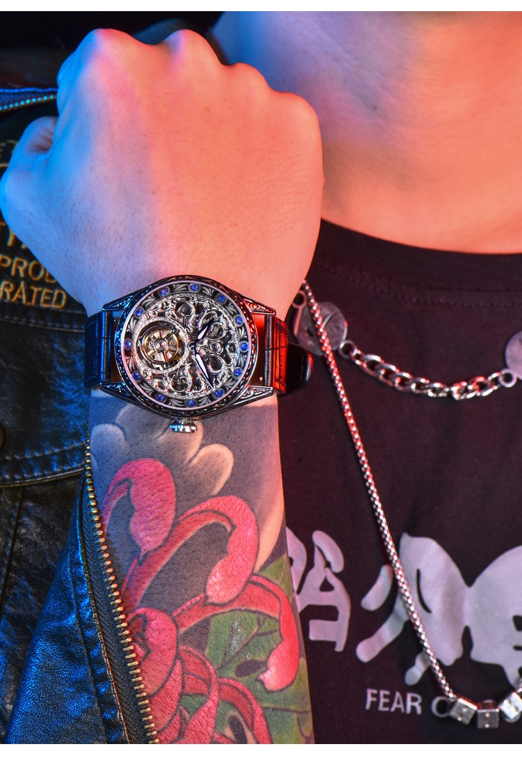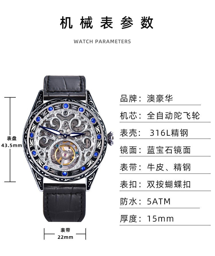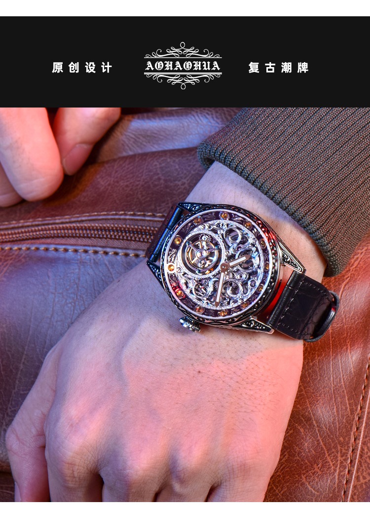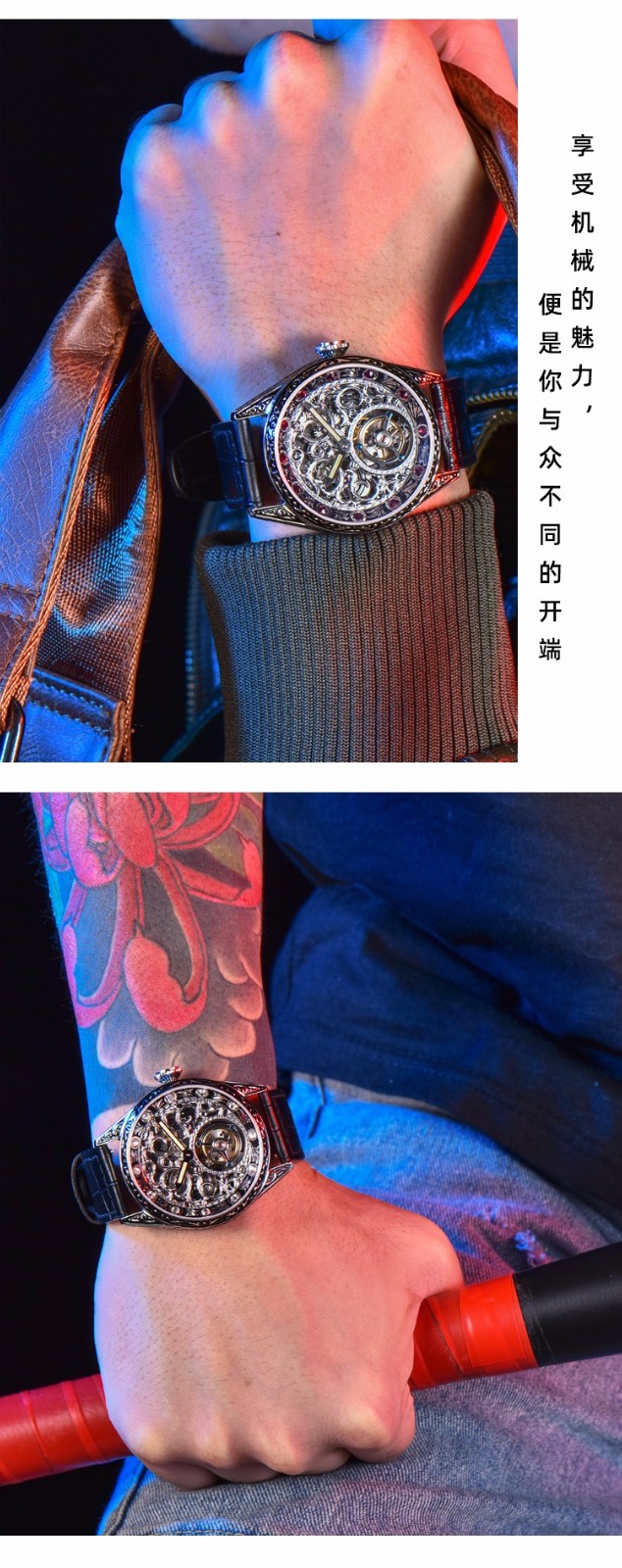 真陀飞轮机械表双面全镂空手表十大品牌男士潮流腕表真皮表带防水