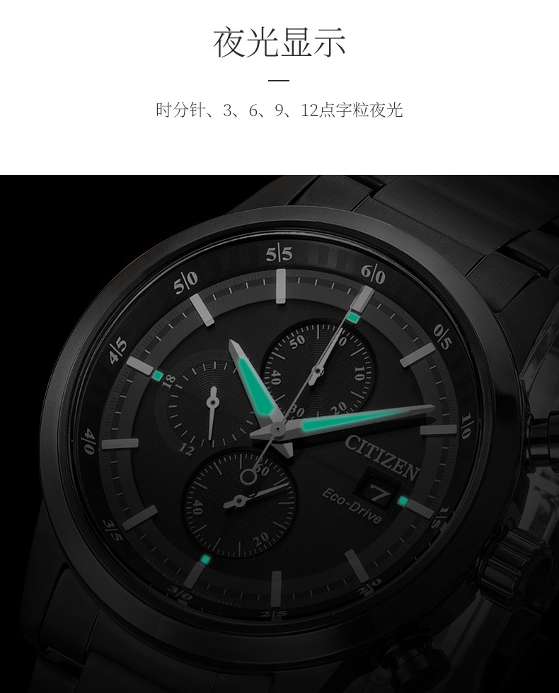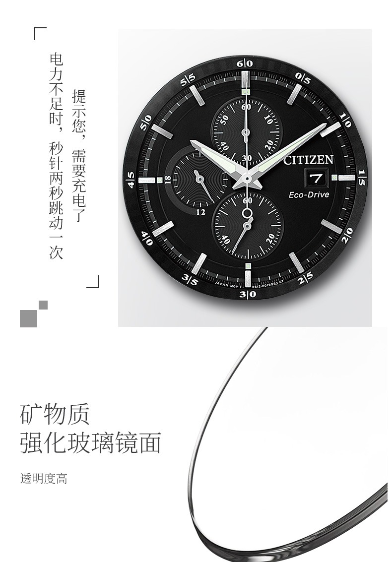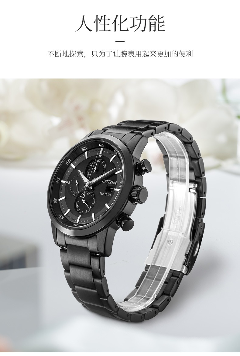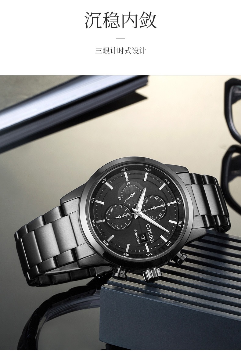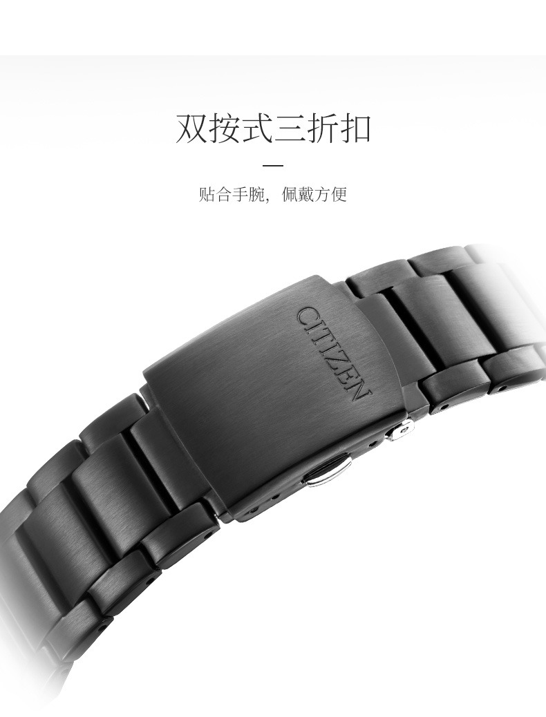 西铁城手表男日本原装正品光动能钢带防水时尚黑色男士腕表CA0615