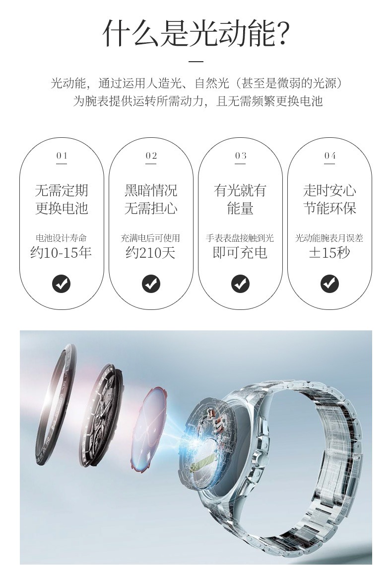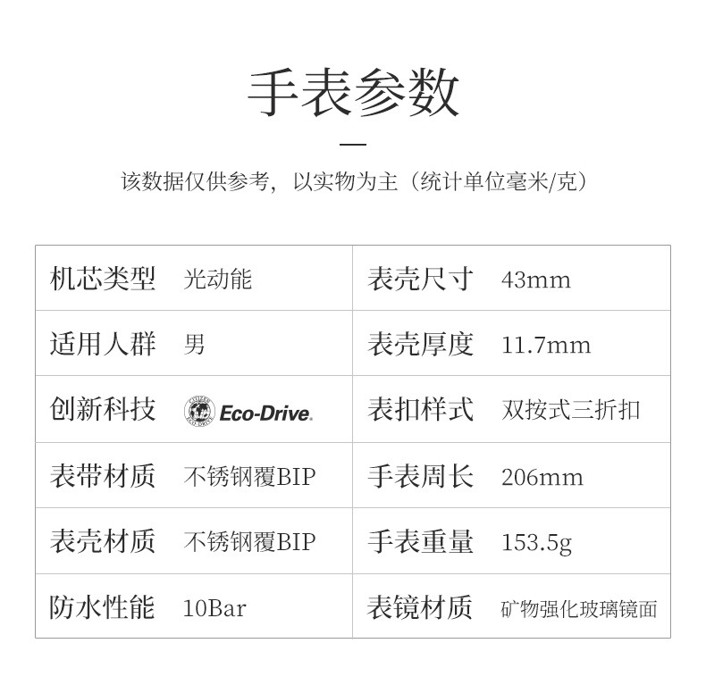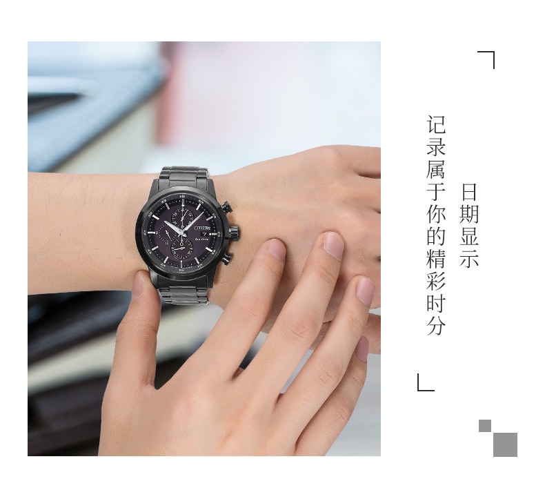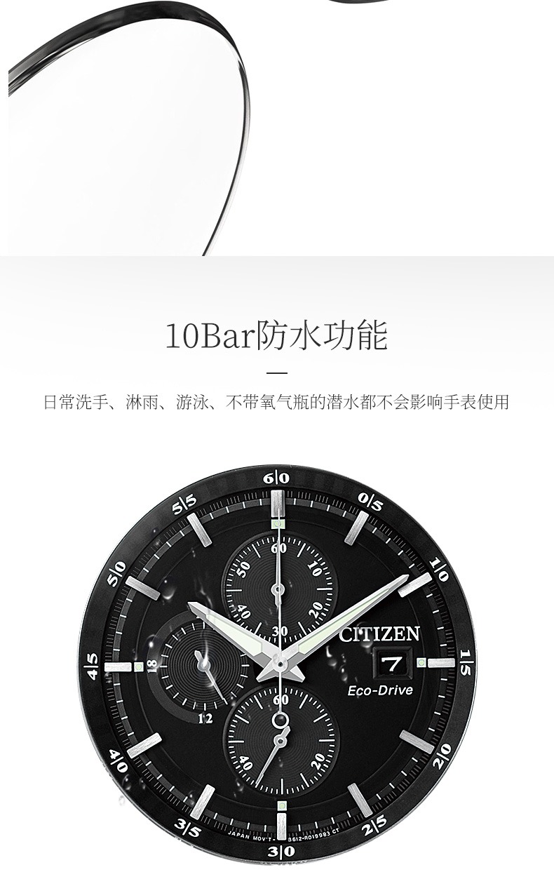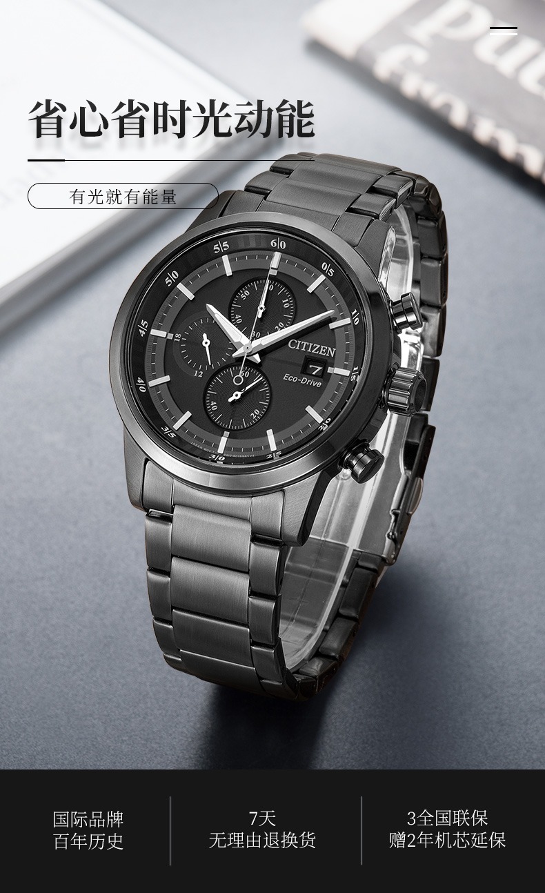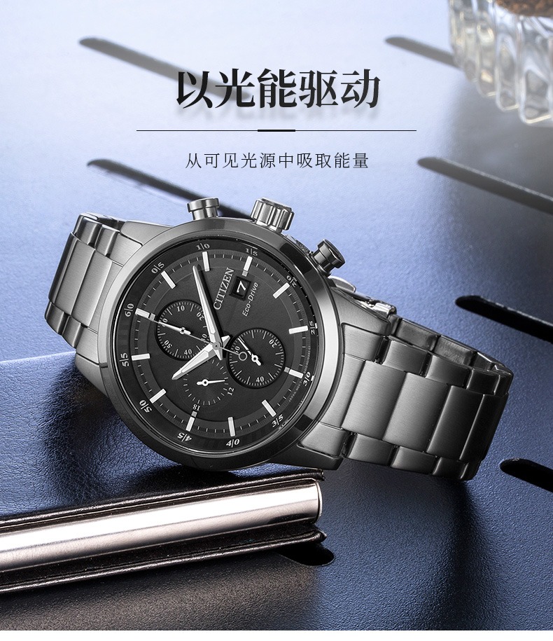 西铁城手表男日本原装正品光动能钢带防水时尚黑色男士腕表CA0615