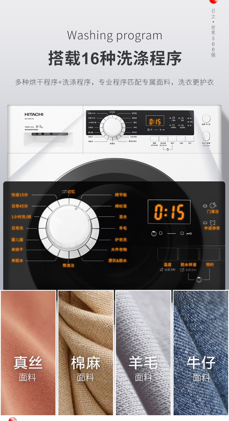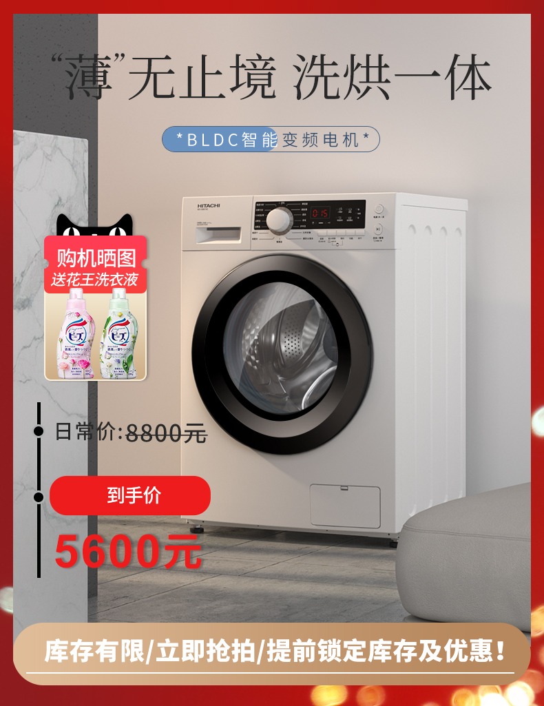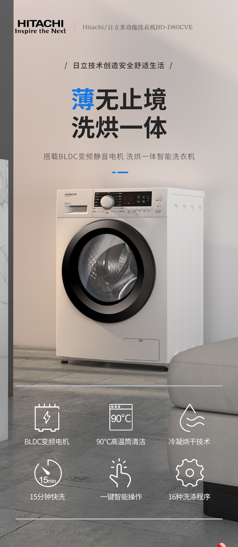 HITACHI/日立8KG全自动洗衣机薄洗烘干一体滚筒变频家用BD-D80CVE