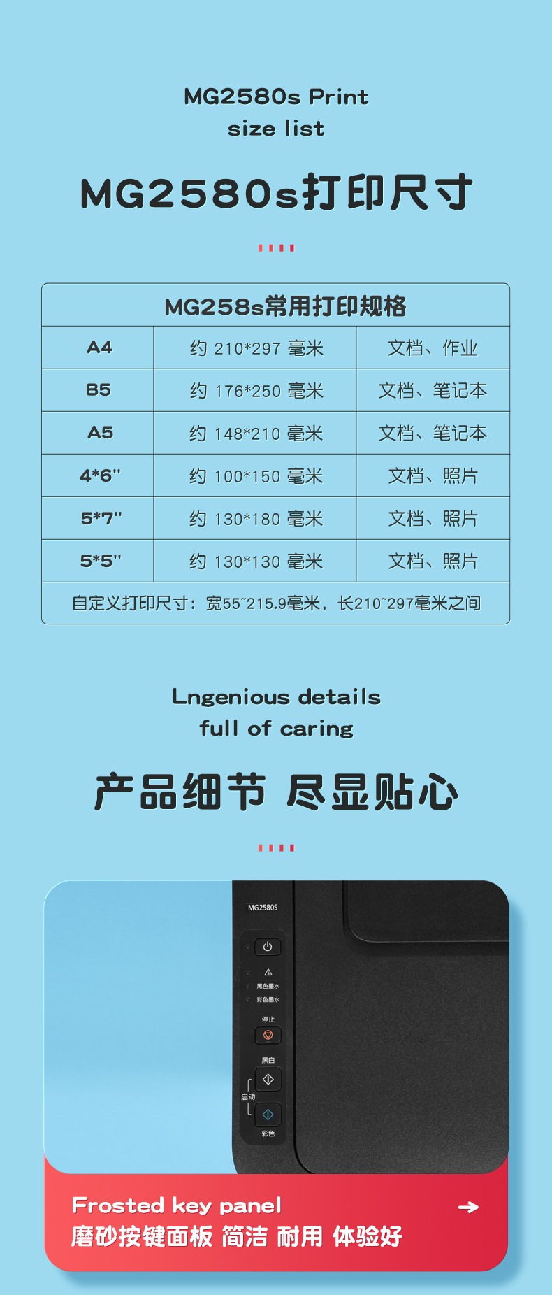 佳能MG2580s打印佳能机家用小型无线连接彩色喷墨A4复印扫描学生家庭作业一体机黑白2400手机wifi迷你多功能办公
