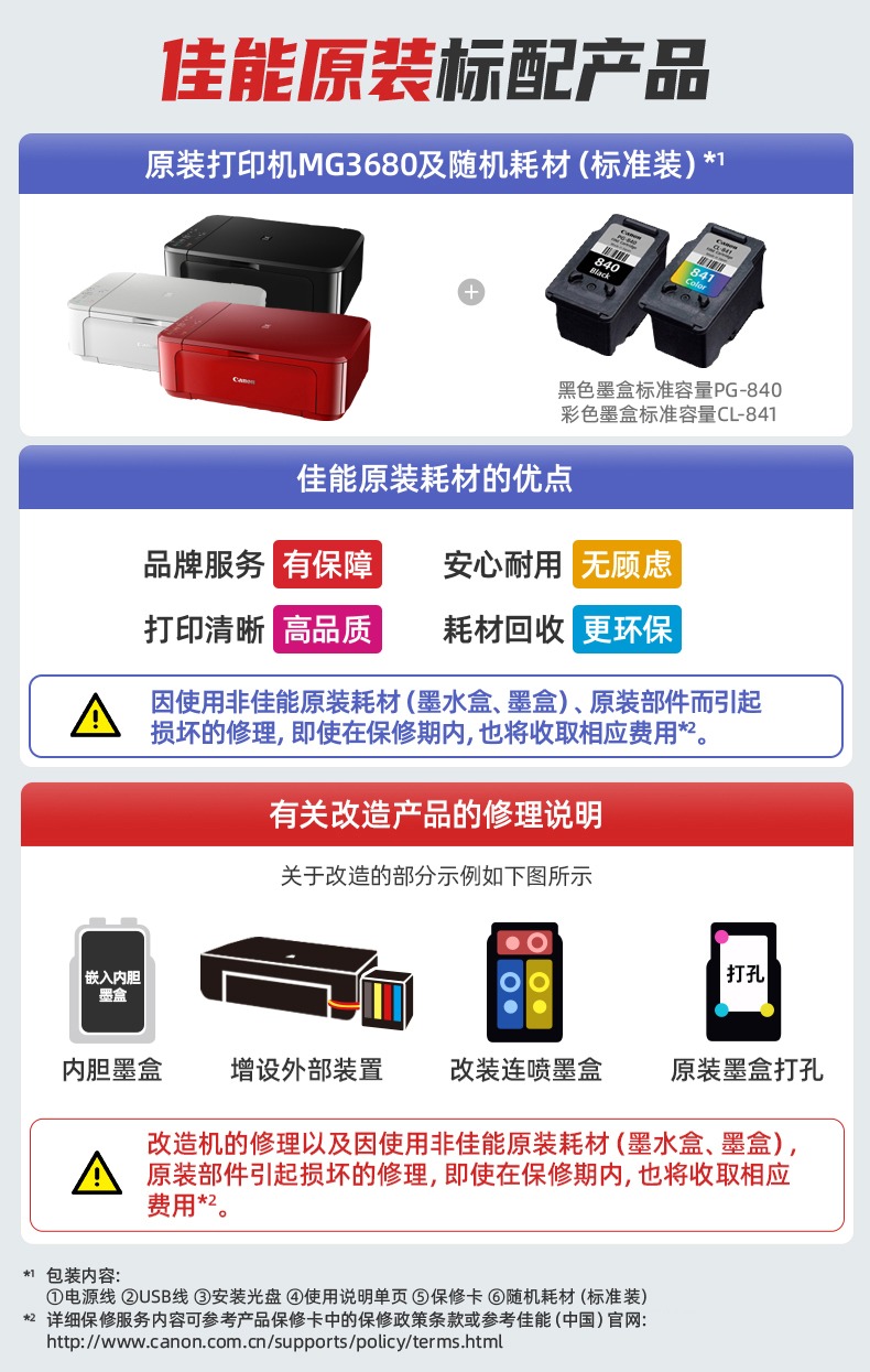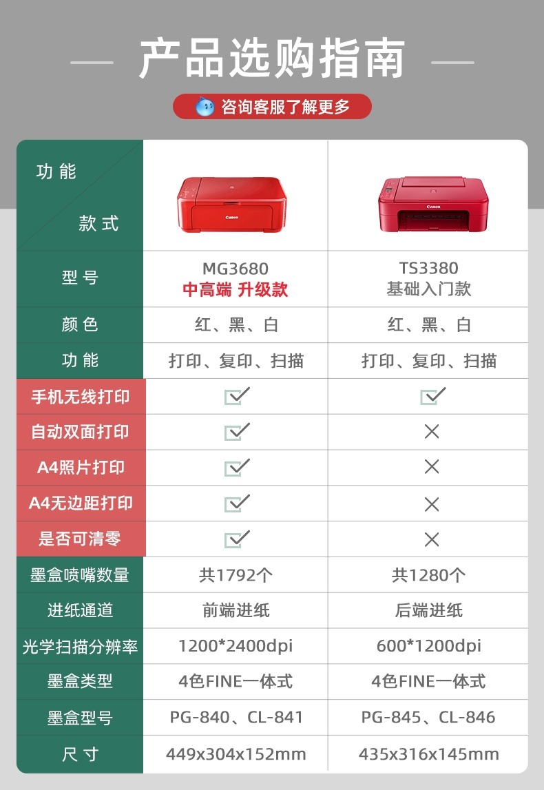 佳能mg3680打印机复印一体机扫描家用办公a4小型喷墨彩色可连接手机照片黑白相片家庭学生无线wifi多功能连供