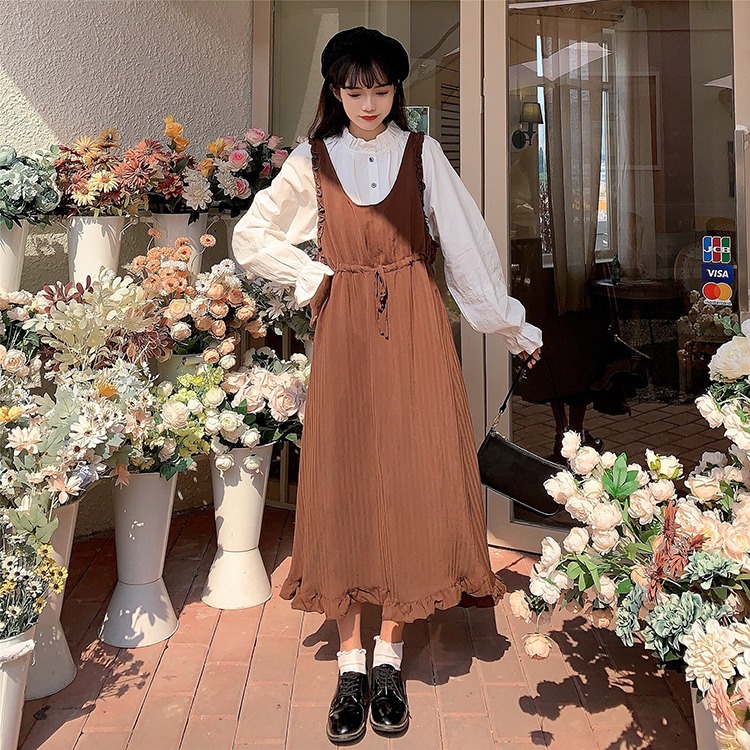 秋冬2020年新款女赫本风纯色木耳边抽绳收腰显瘦中长款背带连衣裙