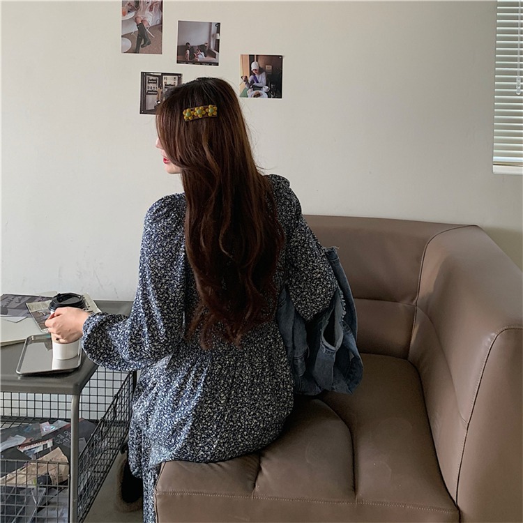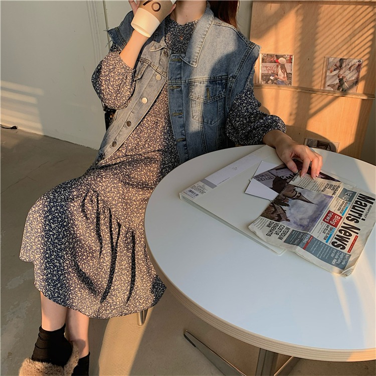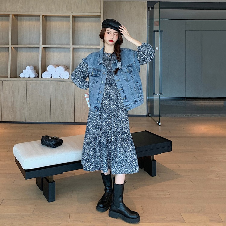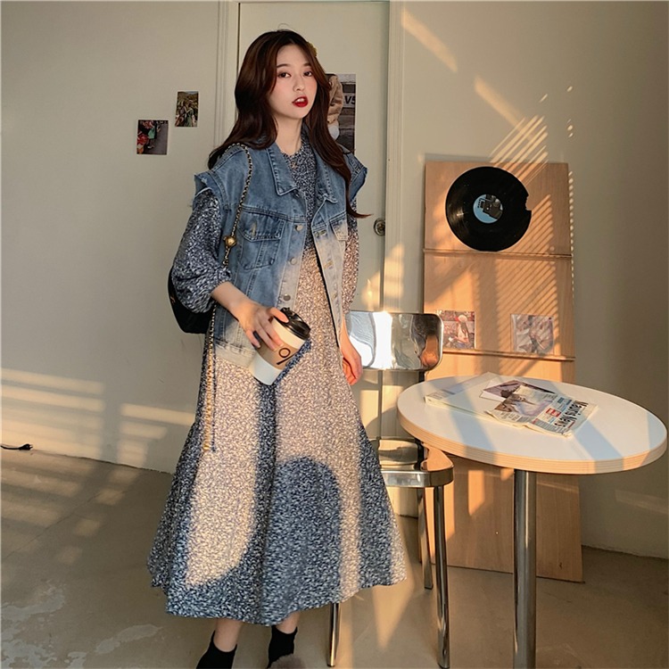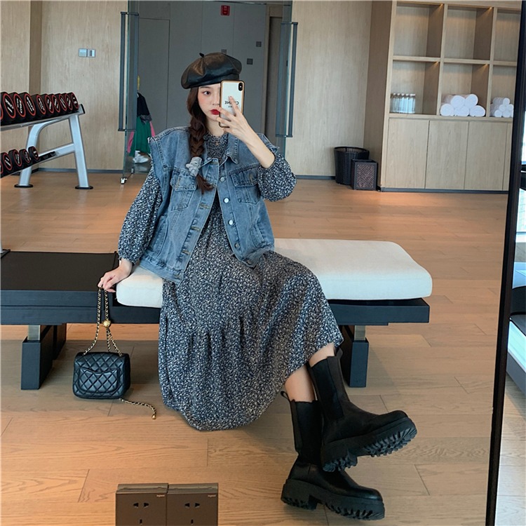 港风套装女复古chic碎花中长款连衣裙女+牛仔外套马甲秋冬两件套