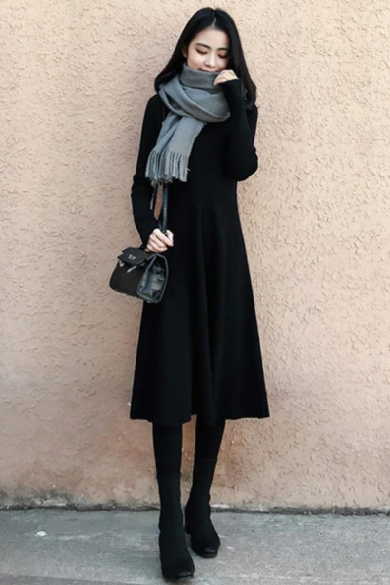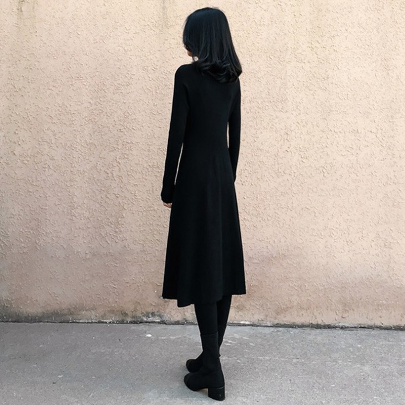 MUAMY秋冬新款法式复古赫本风小黑裙休闲百搭打底长袖针织连衣裙