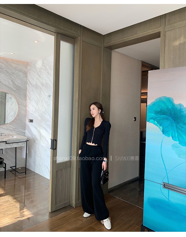 SX善喜黑色羊毛高腰休闲裤阔腿裤宽松显瘦女士裤子垂感百搭秋冬