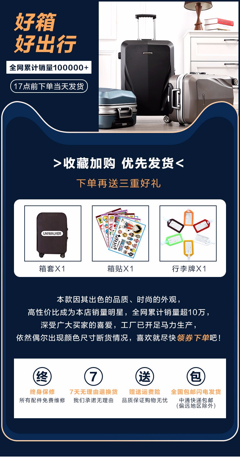 uniwalker纯pc铝框行李箱男万向轮24寸大容量旅行箱学生拉杆箱子