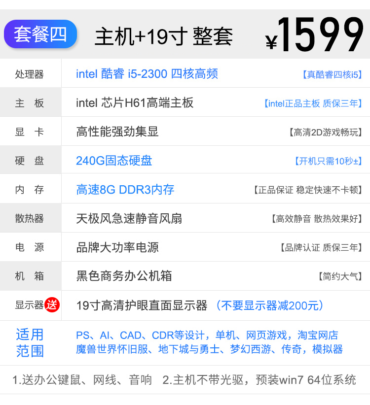 台式全套家用组装整机DIY办公设计作图视频编辑电脑i3i5多开主机