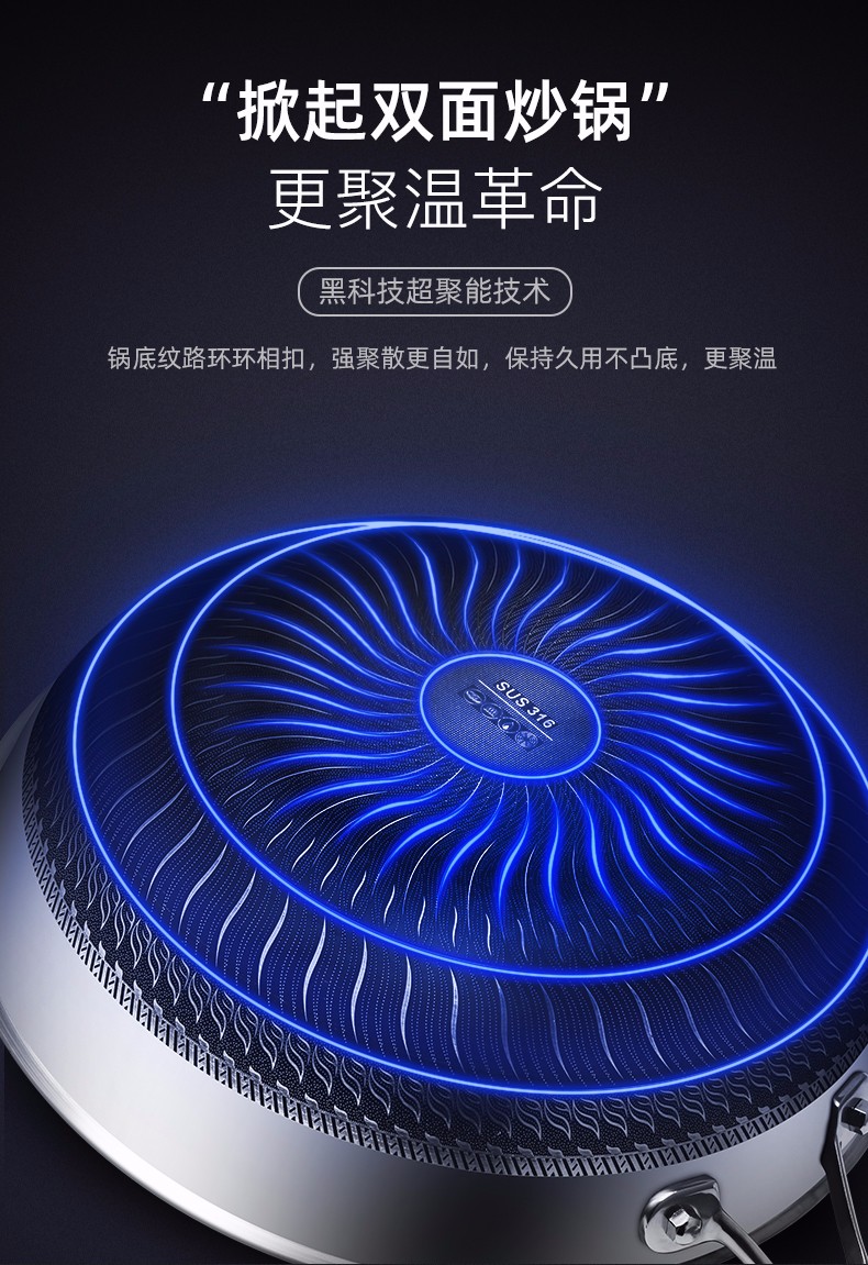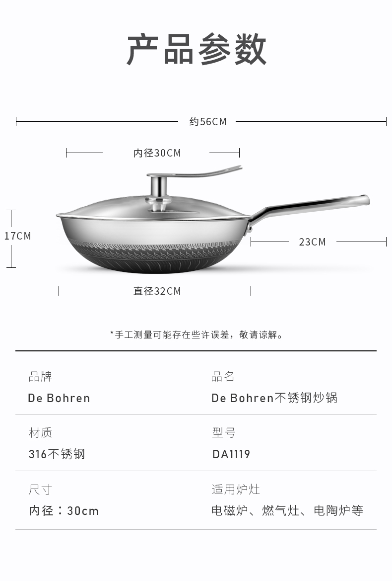 德国De Bohren不锈钢炒锅316无涂层不粘锅多功能家用电磁气灶炉燃